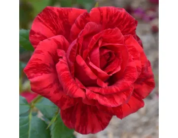 Élégant hybride de thé rouge avec des stries sombres, très vigoureux et florifère ; idéal pour la coupe et la culture en pot.