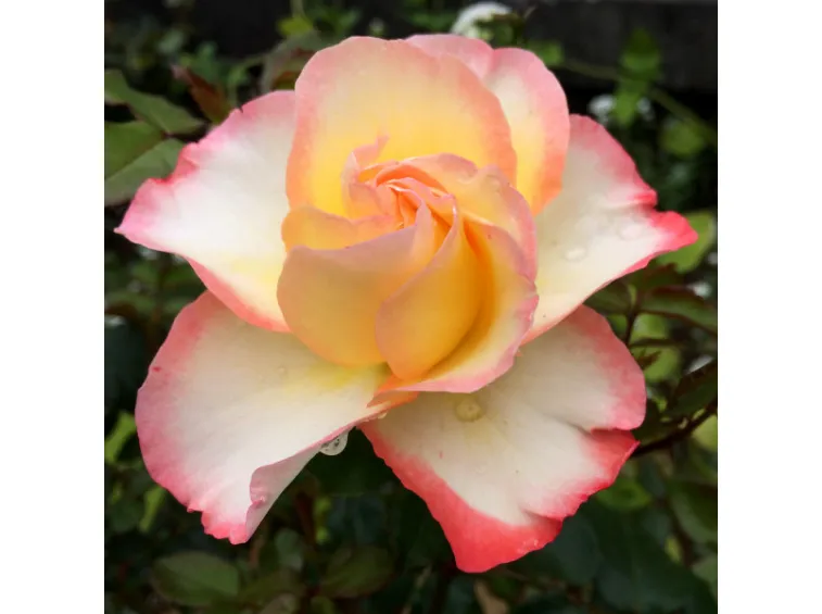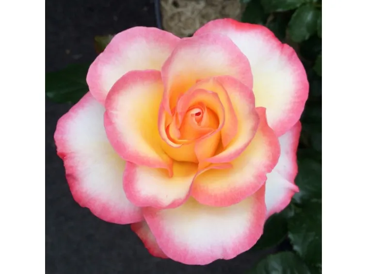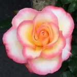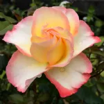 Fleur double, en forme de coupe, de 10 cm de diamètre, composée de 25 pétales initialement crème avec un bord rose et des nuances jaunes au centre, puis, en été, avec des teintes plus chaudes de corail.