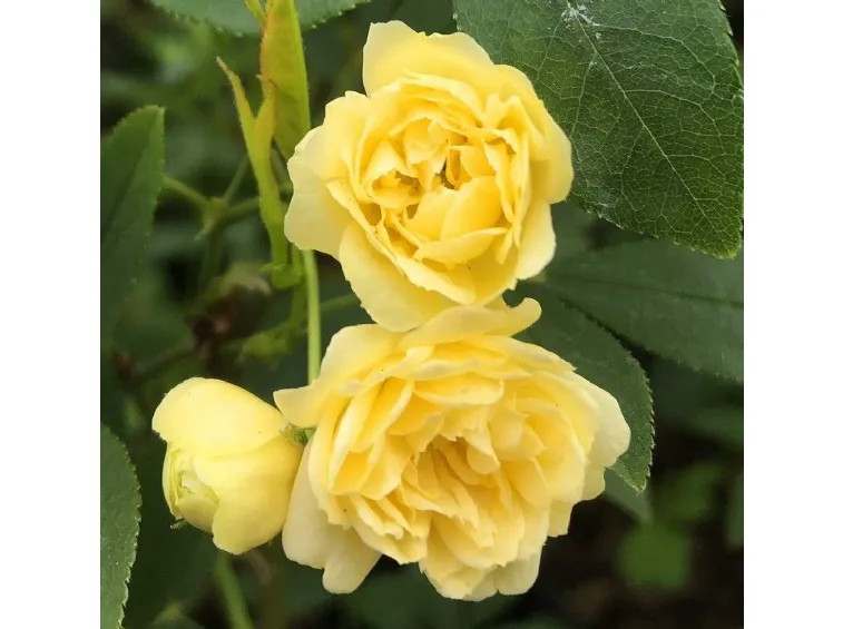 Les fleurs sont petites, doubles, en forme de coupe, d’environ 2 cm de diamètre, composées de plus de 40 pétales jaunes délicatement parfumés. Elles sont portées en grappes et offrent une floraison très abondante mais non remontante.