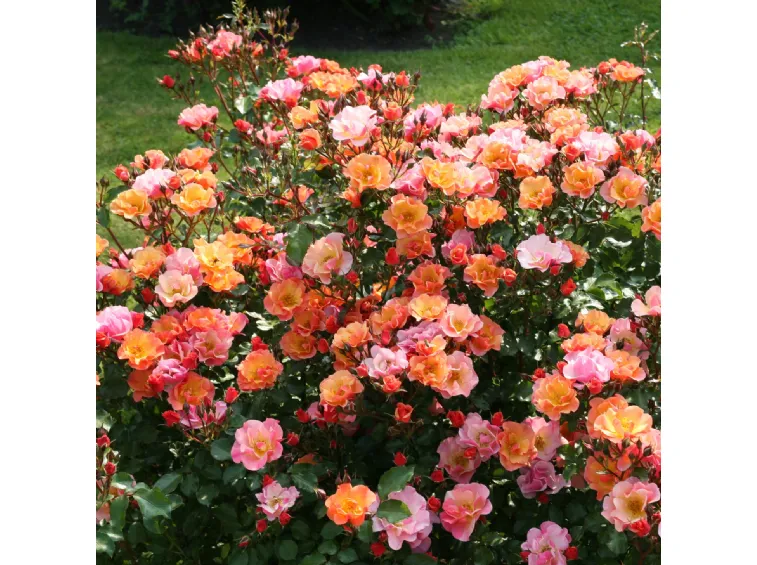 Les fleurs, semi-doubles et en coupe, d’environ 4 cm de diamètre, rappellent une rose pêche et sont composées de 16 pétales cuivre-orangés avec des nuances pêche. Elles sont autonettoyantes et apparaissent en grappes de 5 à 10 fleurs par tige.