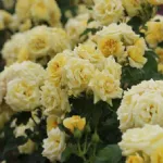 Rose double, en forme de coupe avec un diamètre de 9 cm composé de 35 pétales jaune clair, intense et lumineux; ils sont regroupés en bouquets de 3 à 7 fleurs par tige. Idéales pour les bouquets et les centres de table, les corolles sont d'abord tourbillonnantes, puis ondulées, révélant un cœur d'étamines dorées.