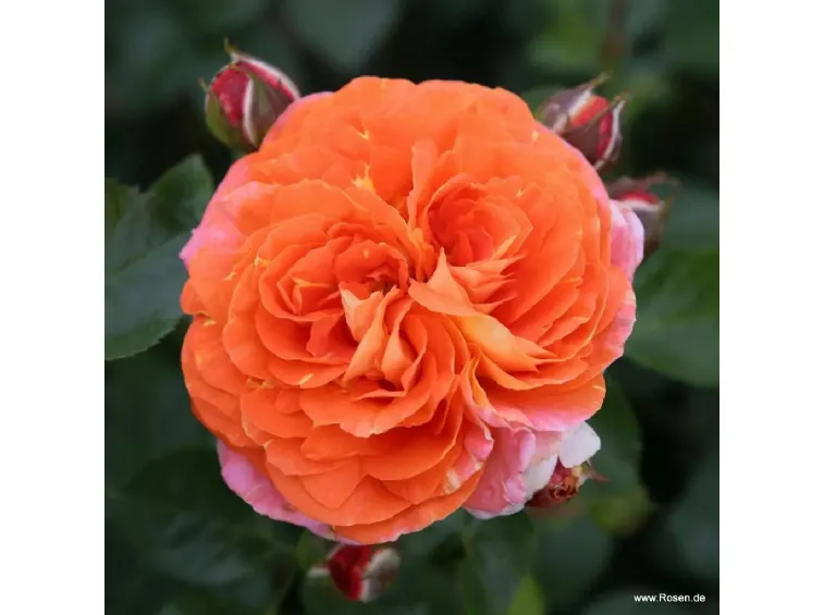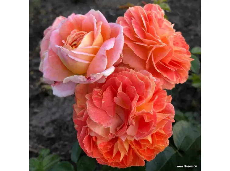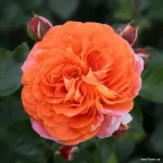 Fleur double, nostalgique, en forme de coupe, de 8 cm de diamètre, composée de 40 pétales d'un orange intense avec un revers jaune; elle fleurit en grappes, légèrement parfumée.