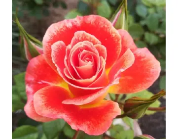Rosier floribunda rouge orangé à bord blanc. Remontant et presque sans épines.