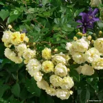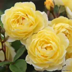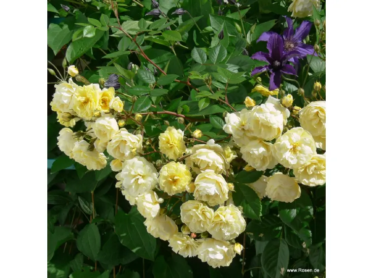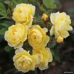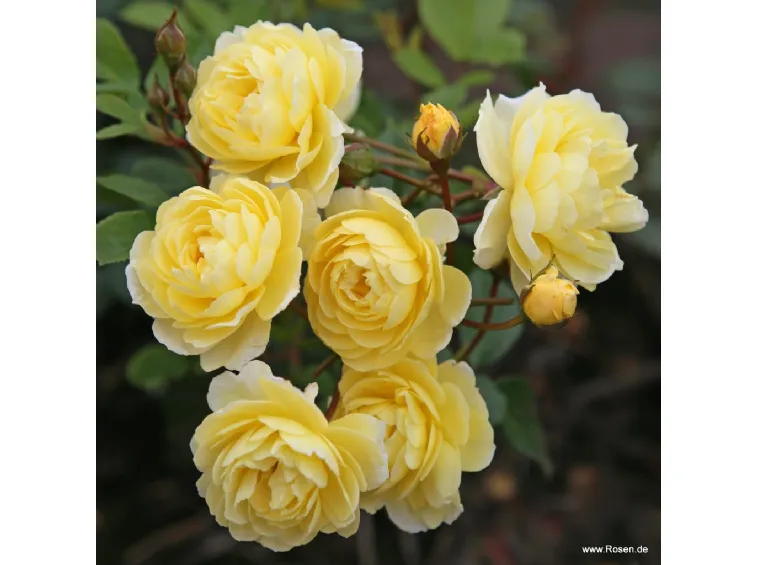 Fleur romantique, double, en forme de coupe, de 4 cm de diamètre, de couleur jaune citron, qui fleurit en petits bouquets légèrement parfumés. Son développement est vertical et bien ramifié, de vigueur modérée, ce qui en fait une option idéale pour les jardins de taille plus réduite. Elle atteint une hauteur de 180 cm et une largeur de 70 cm.