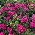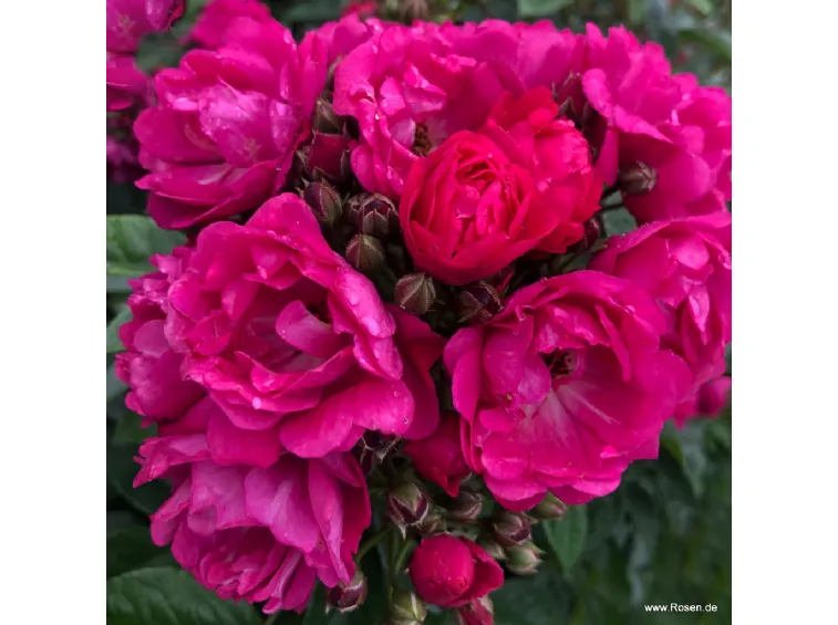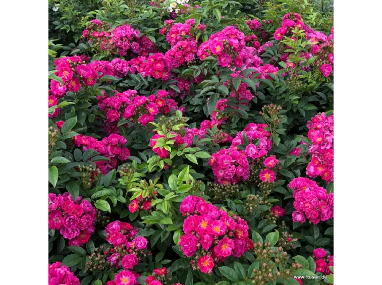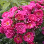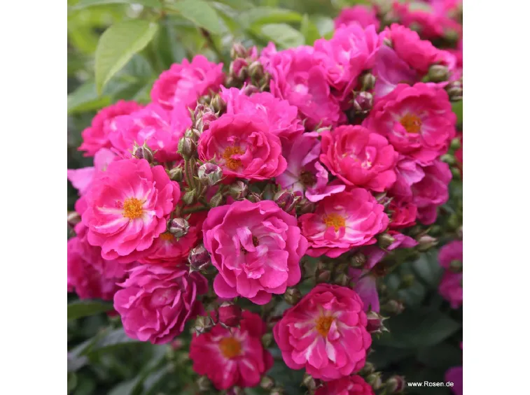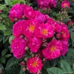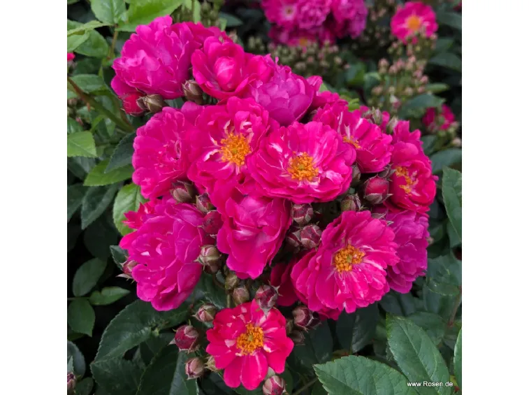 Fleur double en forme de coupe, d'un diamètre de 4 cm, de couleur rose intense, qui fleurit en bouquets avec un parfum agréable; les étamines jaunes sont visibles.